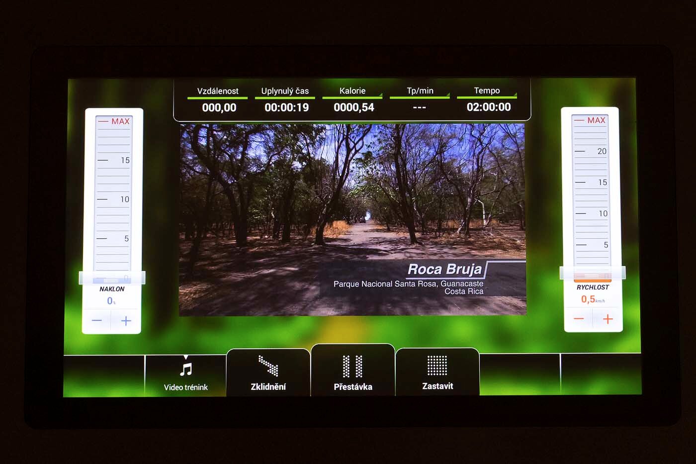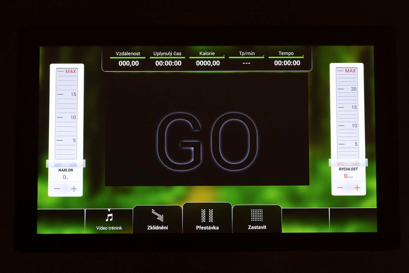 - Zobrazené hodnoty: čas, rychlost, vzdálenost, kalorie, watty, sklon, tepová frekvence