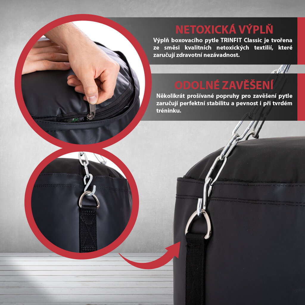 - Rozmery: Rozmery boxovacieho vreca Trinfit Classic 150 x 35 cm zaisťujú dostatočnú veľkosť pre tréning kopov nad pás, ale aj pod pás tzv. low kickov a samozrejme aj úderov. Súčasťou je reťaz, ktorá má dĺžku cca 26 cm (merané bez karabíny) a po zavesení je vrece predĺžené o zhruba cca 23 cm od stropu.