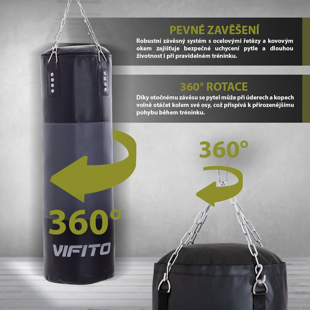 - Rozmery: rozmery boxovacieho vreca VIFITO 150 x 40 cm zaisťujú dostatočnú veľkosť pre tréning kopov aj úderov
