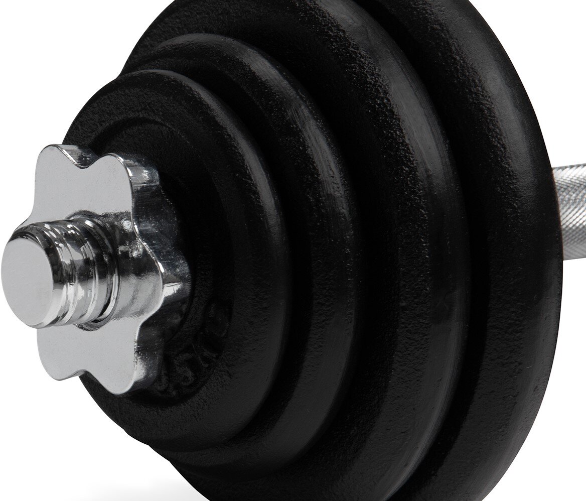 Súprava obsahuje liatinové kotúče, ktoré sú odolné a stabilné, poskytujú pevný kontakt s osou a zaručujú dlhú životnosť. Činka je vhodná pre široké spektrum cvikov zameraných na paže, ramená, chrbát, hrudník aj stred tela. To z nej robí univerzálny tréningový nástroj pre domáce aj rekreačné fitness.