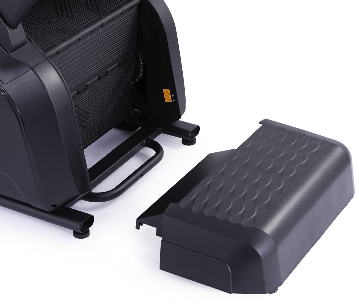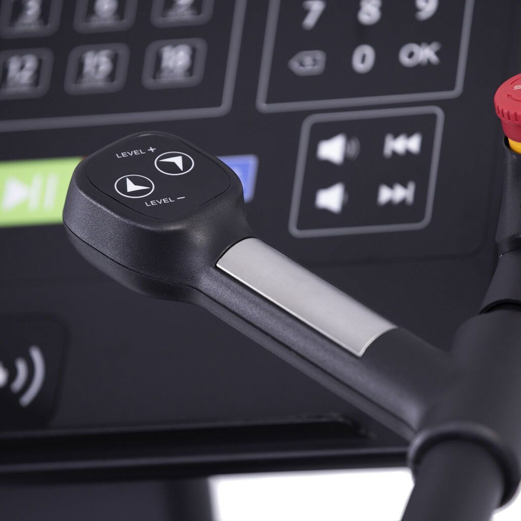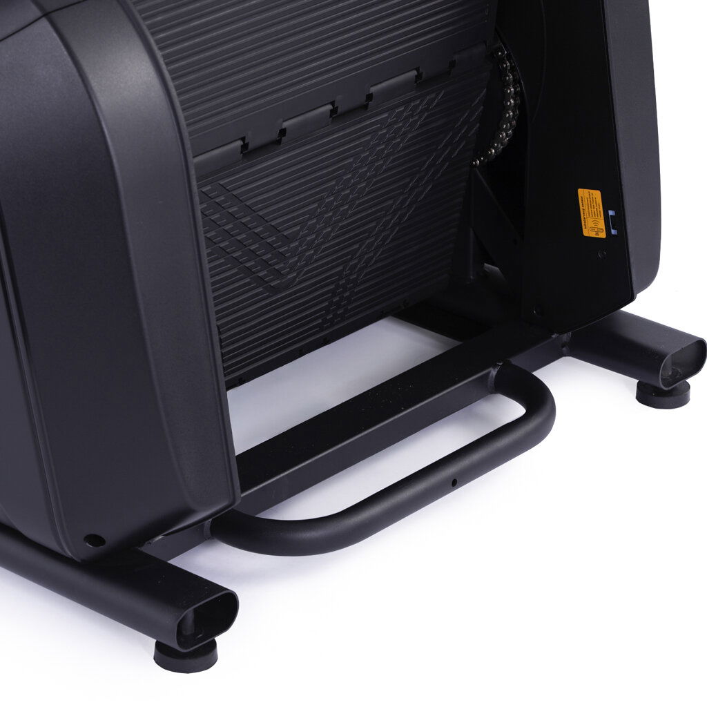 - Elektronicky riadený magnetický odpor umožňuje pohodlné nastavenie záťaže cez tlačidlá alebo tréningové programy. Stroj funguje pasívne – schody sa pohybujú len pri záťaži a automaticky sa zastavia, keď sa na nich nikto nepohybuje. Výsledkom je tichá, úsporná a takmer bezúdržbová prevádzka