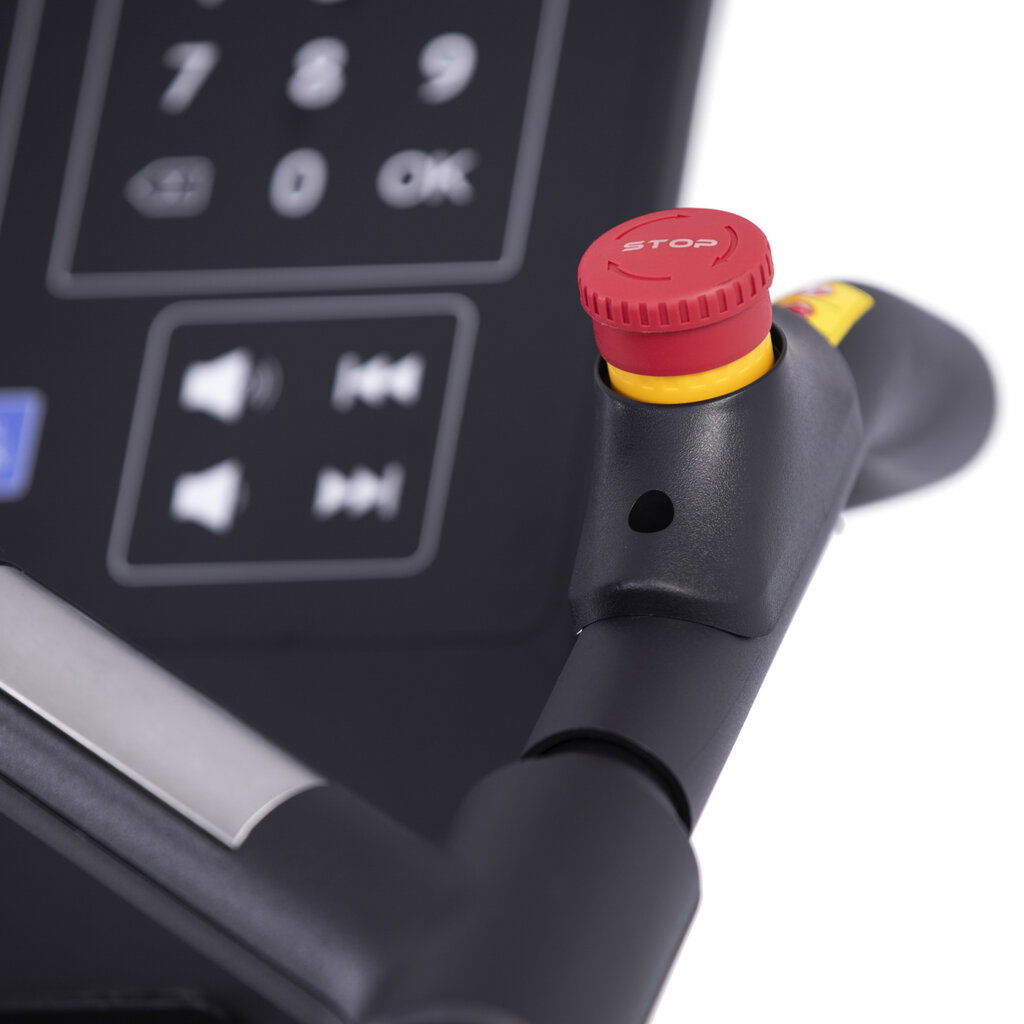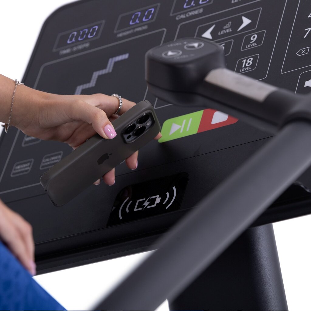 Bezpečnosť je na profesionálnej úrovni - zariadenie má tri núdzové zastavovacie systémy, vrátane infra senzorov a záchytného klipu. Prídavný schod pre bezpečný nástup, držiaky na fľašu a bezdrôtová nabíjačka s kvalitnými reproduktormi zvyšujú komfort každého tréningu.