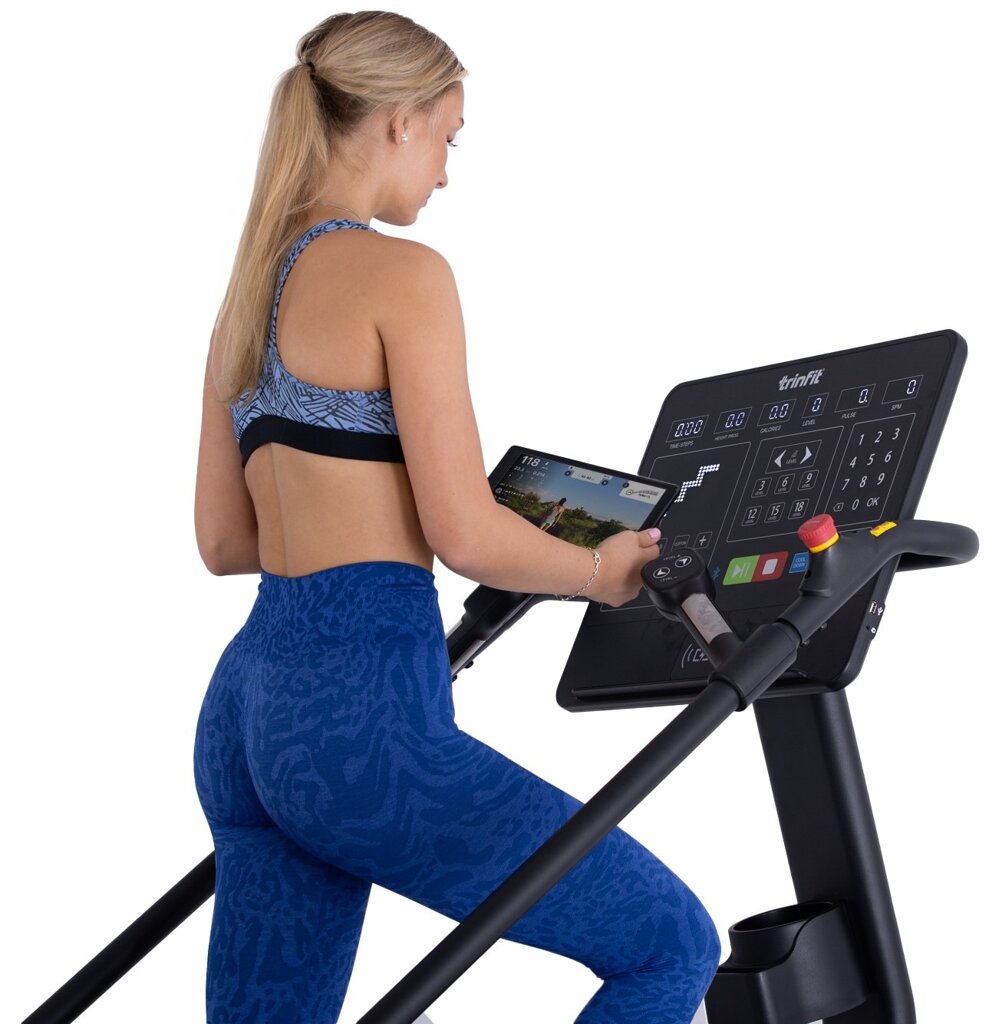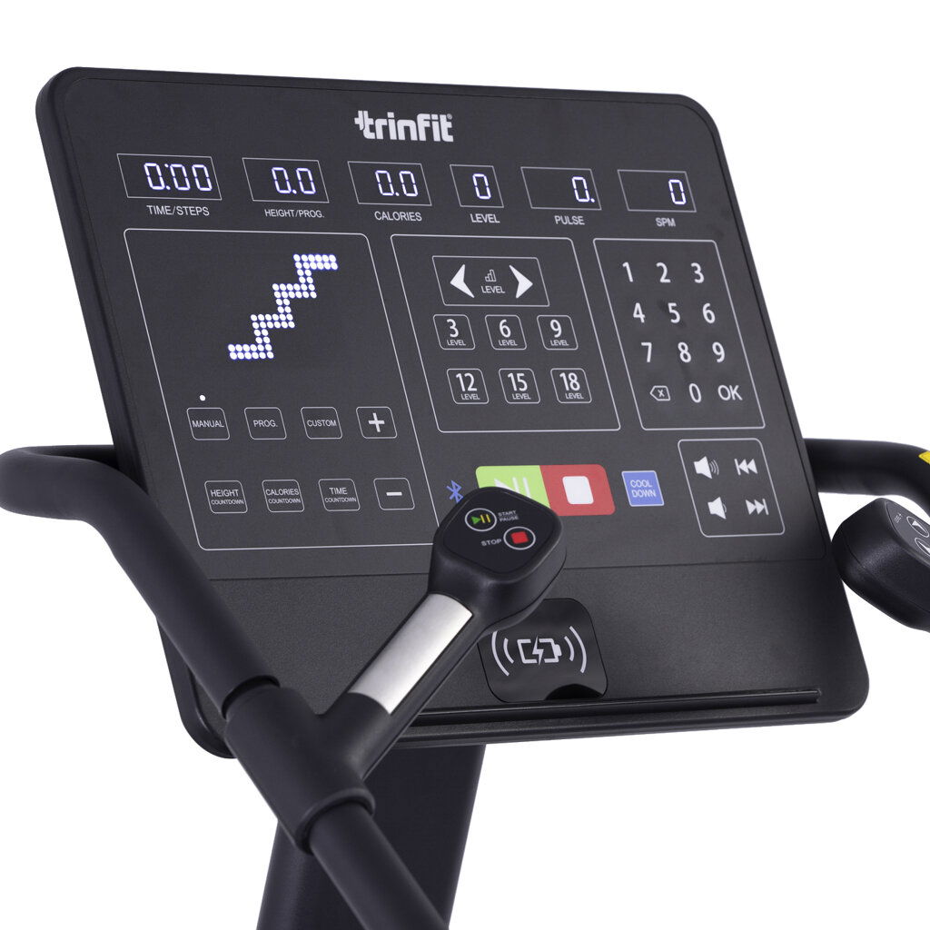 TRINFIT Stair Pro je vybavený intuitívnou konzolou s LED displejom v 6 oknách, na ktorých sledujete všetky dôležité hodnoty ako čas, kroky, vystúpenú výšku, tepovú frekvenciu, úroveň odporu či spálené kalórie. Nechýba ani 36 prednastavených programov, užívateľské režimy, režim FAT, počítadlo krokov alebo kalórií a funkcie CoolDown.