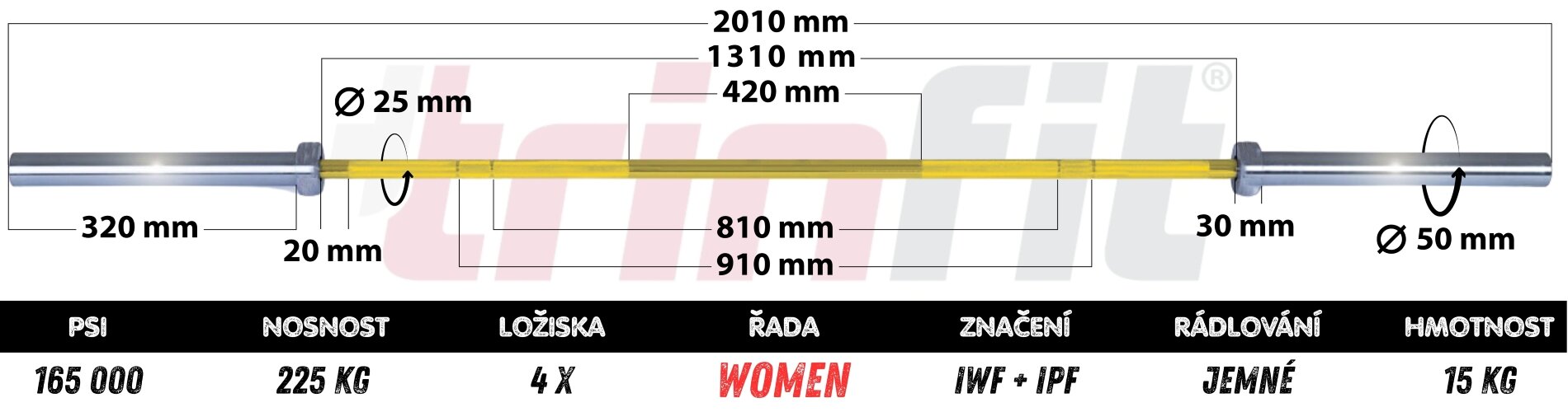 Dámska olympijská os z kvalitnej ocele jemné radlovanie 4 x ihličkové ložiská, cerakote povrch priemer 50 mm, dĺžka 2010 mm hmotnosť 15 kg, 165 000 PSI značenie IWF + IPF