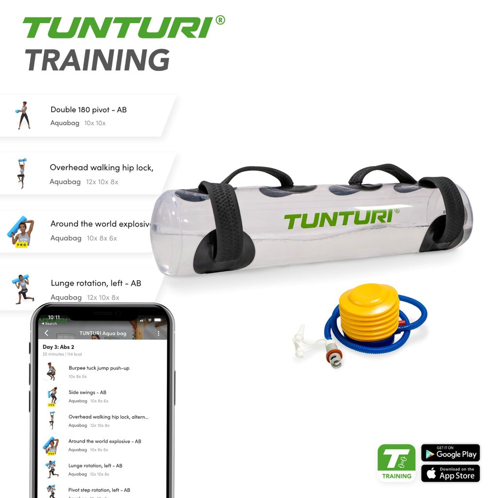 - Tunturi Aquabag je dokonalým nástrojom na tréning s nestabilitou. Voda má určitú pomalosť pohybu, vďaka čomu je cvičenie s aquabagom intenzívnejšie ako relatívne stabilný vak plnený pieskom. Môžete ovplyvniť mieru nestability. Čím menej vody do vaku napustíte, tým ľahšie sa voda bude pohybovať a cvičenie bude ťažšie. To je ideálne na úpravu intenzity cvičenia, čo vám umožní dosiahnuť mnoho rôznych cvičebných cieľov.