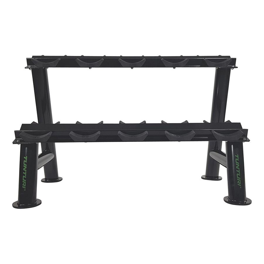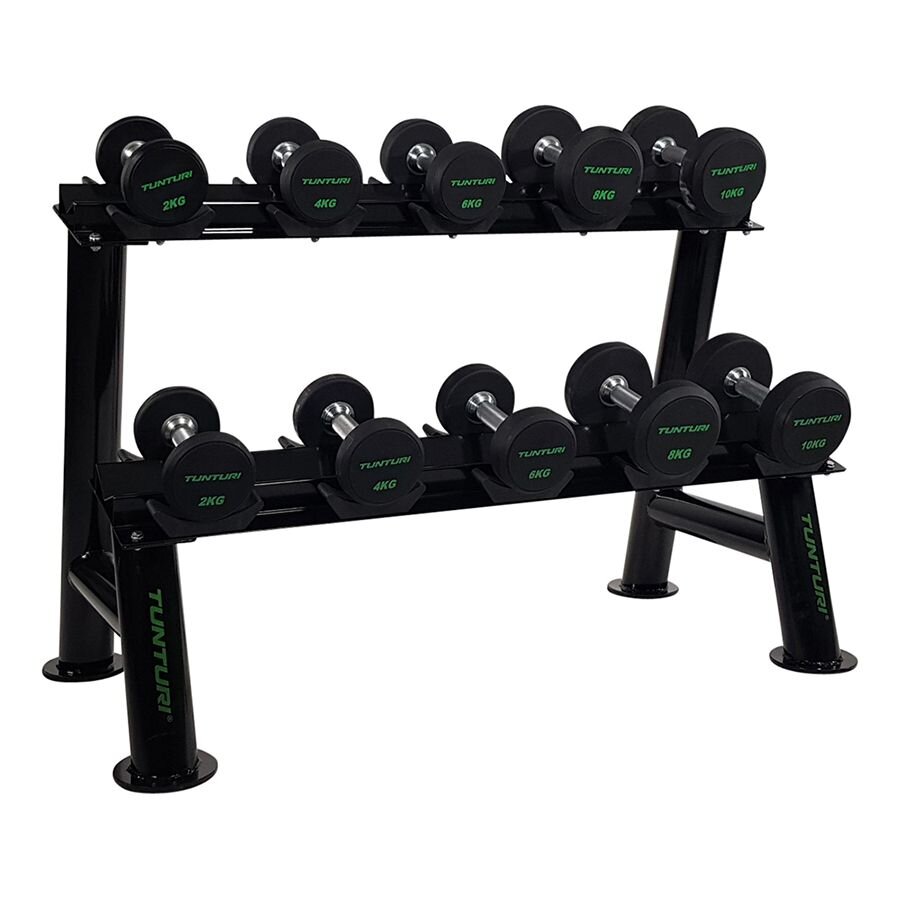 Stojan na jednoručky TUNTURI PRO Dumbbell Rack je praktické a bezpečné riešenie na uloženie činiek vo vašej domácej alebo komerčnej posilňovni. Vďaka robustnej oceľovej konštrukcii s dvomi policami pojme až 5 párov jednoručiek a udrží tréningový priestor prehľadný a bez rizika zakopnutia.