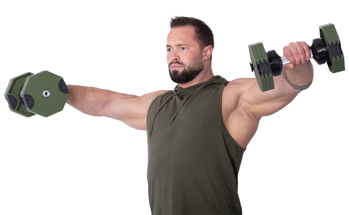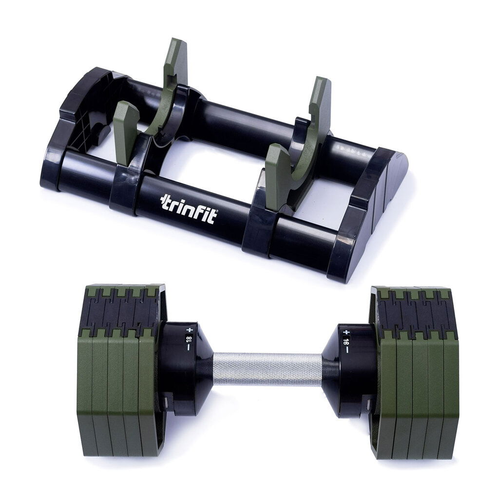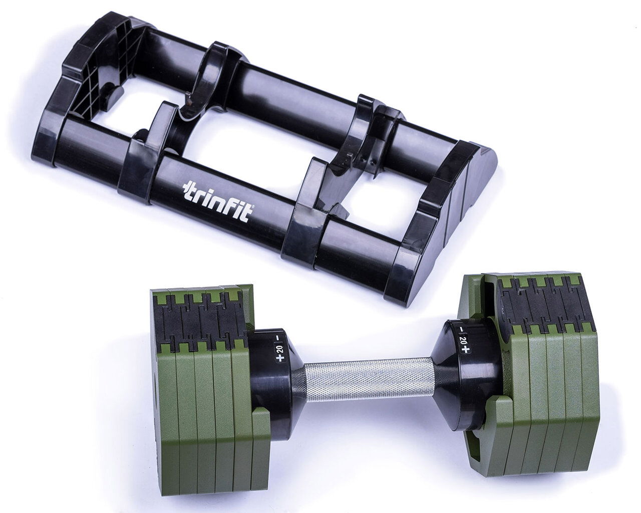 Tento set obsahuje činku s voliteľnou hmotnosťou v 10 úrovniach, od 2 do 20 kg v krocích po cca 2 kg. Bezpečný tréning a jednoduchú manipuláciu zaisťuje patentovaný blokovací mechanizmus. Samotná hmotnosť je možné upraviť iba v okamihu keď je činky uložená v základnom stojane, ktorý je samozrejme súčasťou balenia.