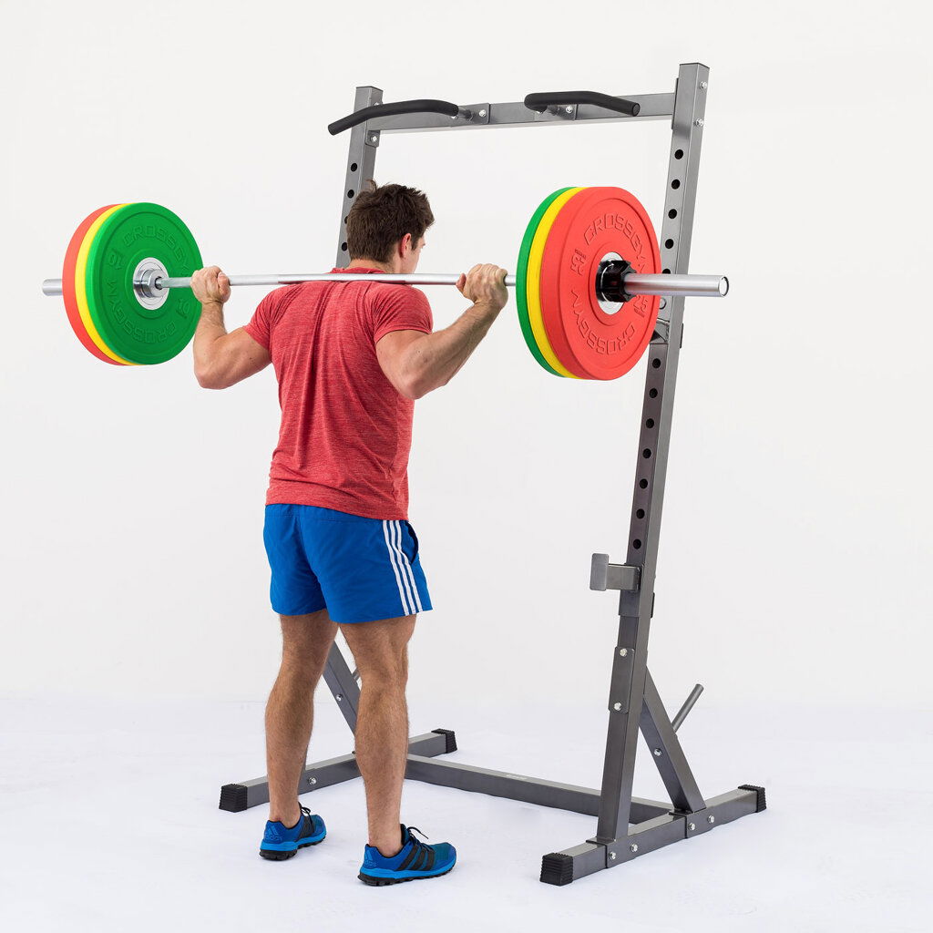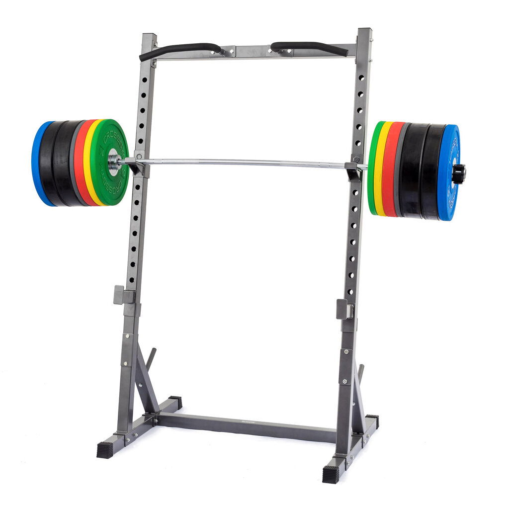 Stojan na činku TRINFIT Rack HX6 je klasická stojanová konštrukcia doplnená praktickou hrazdou, využiteľná na drepy, či ako doplnok k posilňovacej lavici. Priaznivý pomer ceny, kvality a funkčnosti robí z tohto stojanu ideálny doplnok posilňovne. Masívna konštrukcia z profilov 60 x 60 x 2 mm a premyslená konštrukcia stojanu TRINFIT Rack HX6 spolu s gumovými nožičkami zaisťuje stabilitu a bezpečnosť pri tréningu.