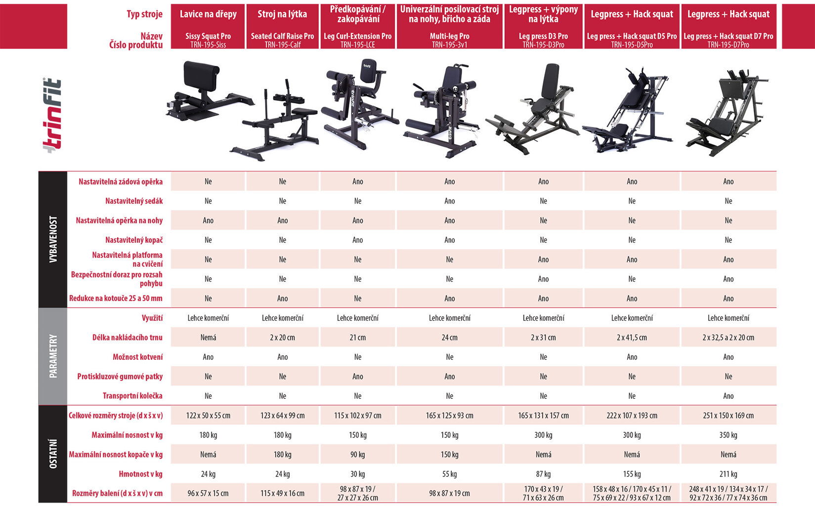 TRINFIT Seated Calf Raise Pro má k dispozícii 2 nakladacie tŕne s priemerom 25 alebo 50 mm, na ktoré si používateľ sám naloží kotúče, a tým určí záťaž s ktorou bude cvičiť. Cvičiť môžu teda začiatočníci aj skúsení jedinci. Stroj ponúka prirodzene ergonomické posilňovanie, a to predovšetkým vďaka nastaviteľným opierkam na nohy a pohodlnému sedadlu. Protišmykové hliníkové nášľapy a rukoväte slúžia na maximálny komfort. Pre bezpečnosť pri cvičení stroj disponuje bezpečnostnou pákou.