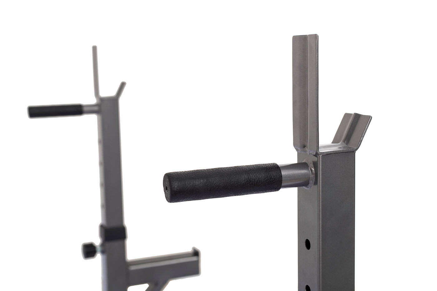 Stojan umožňuje nastavenie šírky stojanu do 10 polôh, je ho možné jednoducho prispôsobiť vašej činke a požadovanej šírke úchopu. Okrem vlastných odkladacích tŕňov je stojan TRINFIT Rack HX3 (ako jeden z mála v tejto kategórii) vybavený aj ďaľšími pogumovanými bezpečnostnými odkladacími dorazmi na činku pre prípad, že ju už nie ste schopný zdvihnúť, prípadne tieto dorazy možno využiť aj ako odkladaciu plochu napr. pri cvičení bicepsu a ďalších cvikov. Nemusíte tak činku odkladať na zem. Praktické sú aj bradlá, ktorými je stojan vybavený a možnosť zloženia stojanu po docvičení na úsporu miesta.