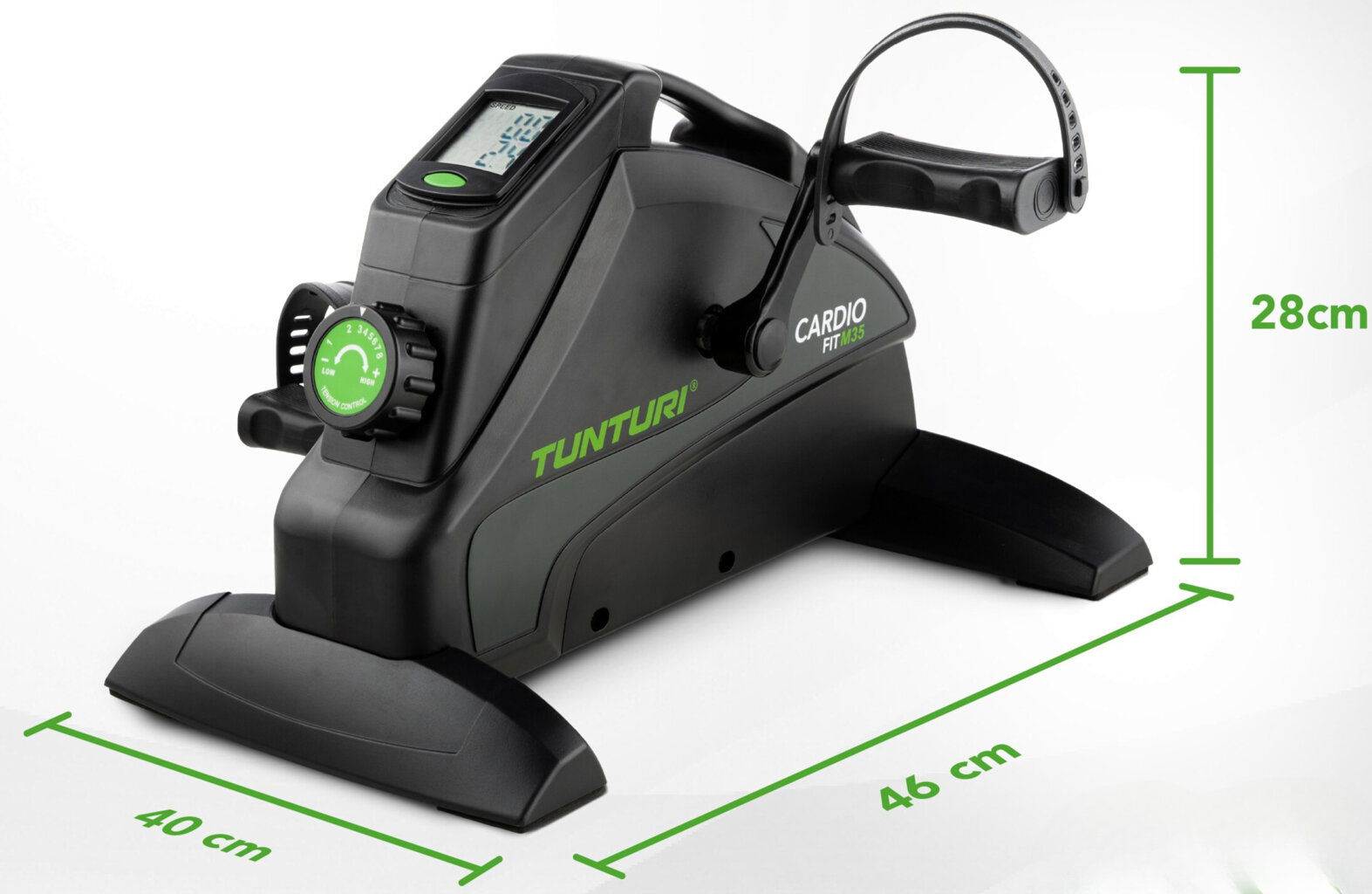 TUNTURI CARDIO FIT M35 minibike je cvičebný doplnok, ktorý je určený pre nenáročných užívateľov pre ľahké rehabilitačné cvičenia v domácich podmienkach. Mini bike šetrí miesto v domácnosti a zároveň je veľmi ľahké s týmto strojom manipulovať a premiestňovať ho. Pretože je stroj naozaj malý, môžete cvičiť napríklad v obývačke pri sledovaní televízie alebo čítaní knižky.