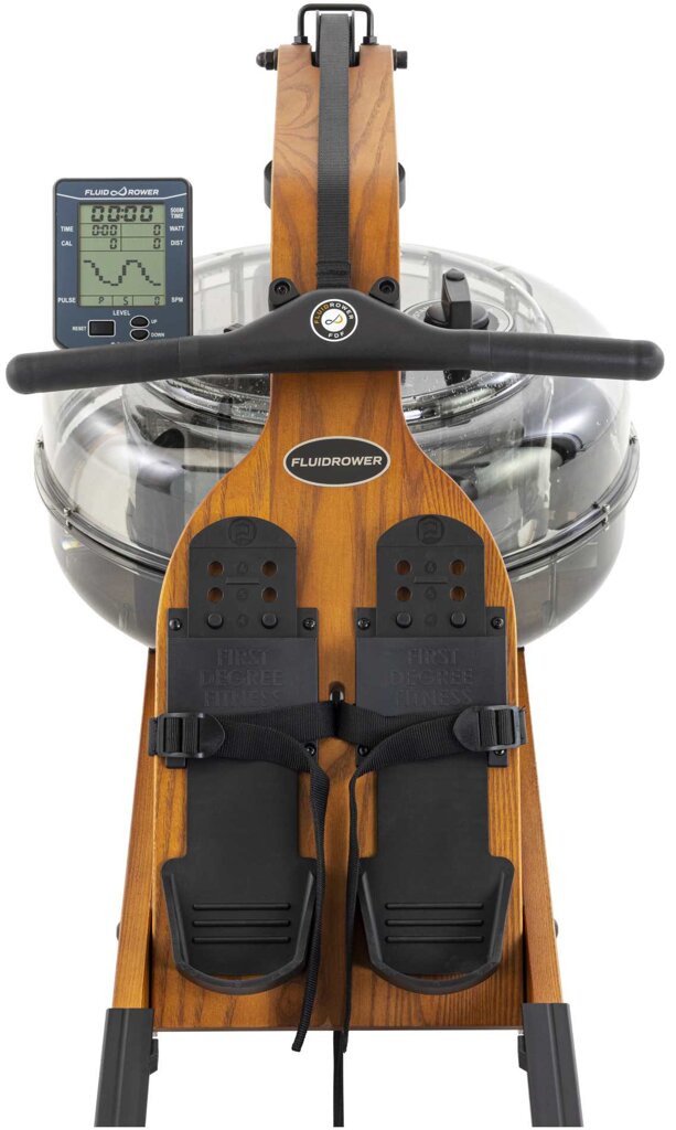 TUNTURI Fluid Rower Viking 3 V je prémiový veslovací trenažér pre domáce použitie, ktorý vyniká jedinečnou kombináciou luxusného vzhľadu a špičkovej funkčnosti. Ručne vyrobený rám z amerického jaseňa s povrchovou úpravou v odtieni Golden Oak dodáva stroju nielen eleganciu, ale aj mimoriadnu odolnosť. Patentovaná technológia V Twin Tank poskytuje 5 úrovní plynule nastaviteľného vodného odporu s realistickým pocitom veslovania, ktoré verne napodobňuje záber na skutočnej vodnej hladine.