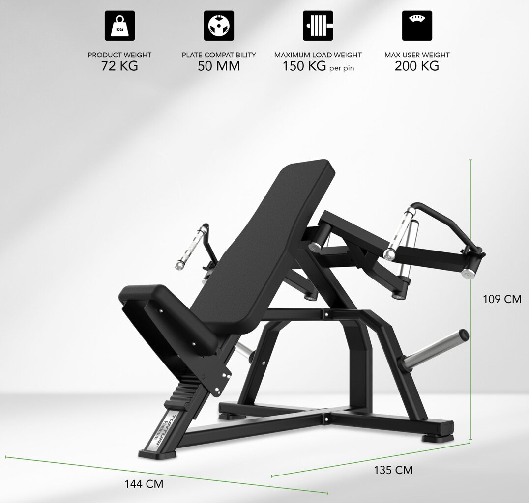 Stroj je vyrobený z ocele s hrúbkou 2,5 mm, doplnený o odolné PU čalúnenie a pogumované úchopy. Je kompatibilný s olympijskými kotúčmi s priemerom 50 mm a zvládne záťaž až 150 kg na každom ramene stroja. Súčasťou konštrukcie sú praktické tŕne na odkladanie kotúčov, čo prispieva k prehľadnosti a efektivite tréningového priestoru.