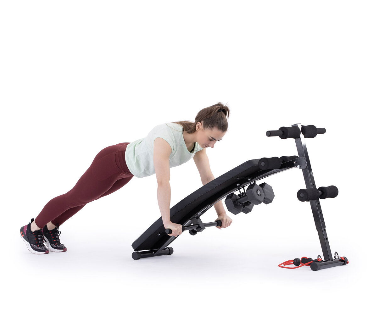 - Univerzálna lavica na brucho, cvičenie s jednoručkami a expandéry