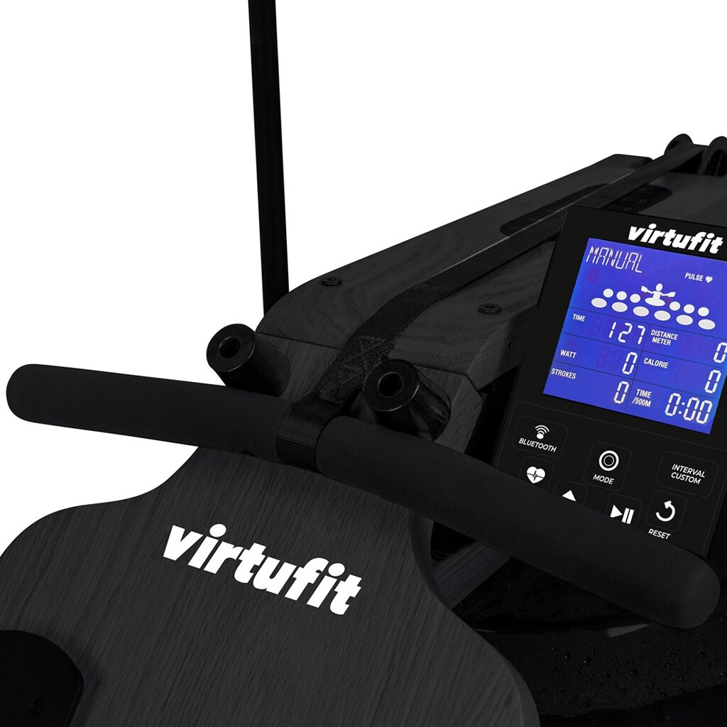Veslovací trenažér VirtuFit Elite Water Resistance Wood je vybavený prehľadným počítačom s držiakom na tablet/smartphone, transportnými kolieskami a vyrovnávačmi nerovnosti.