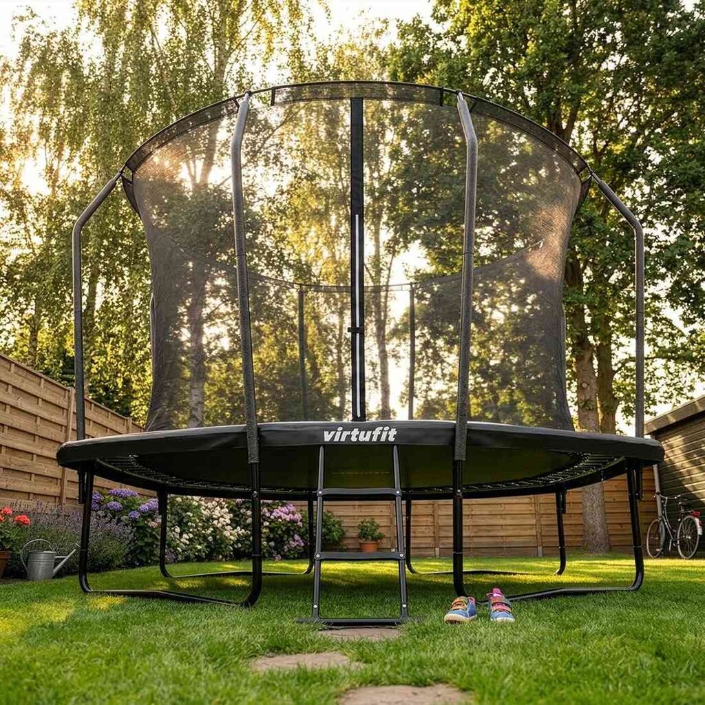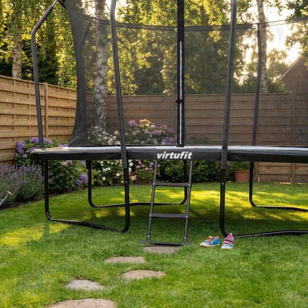 Súčasťou balenia je aj pevný rebrík, ktorý zaisťuje pohodlný a bezpečný vstup na trampolínu. VIRTUFIT kladie veľký dôraz na bezpečnosť, a preto sú trampolíny tohto radu testované podľa európskych noriem EN71-1, EN71-2, EN71-3 a EN71-14.
